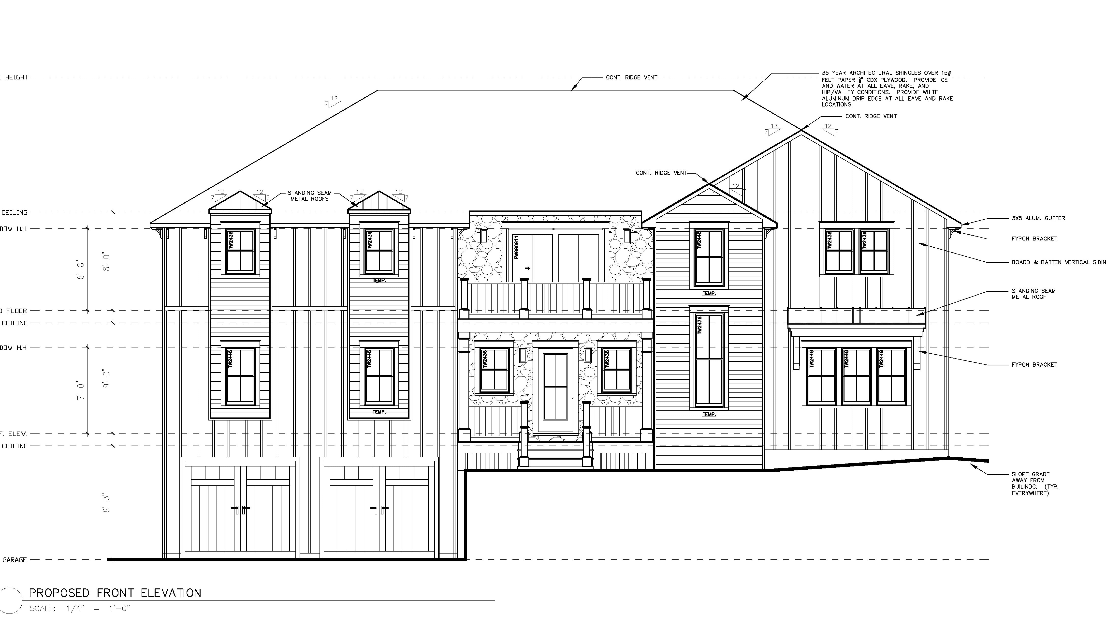 4,500 square foot custom home. Features standing seam metal roofs, two-tone railings, corbels, and stone veneer.