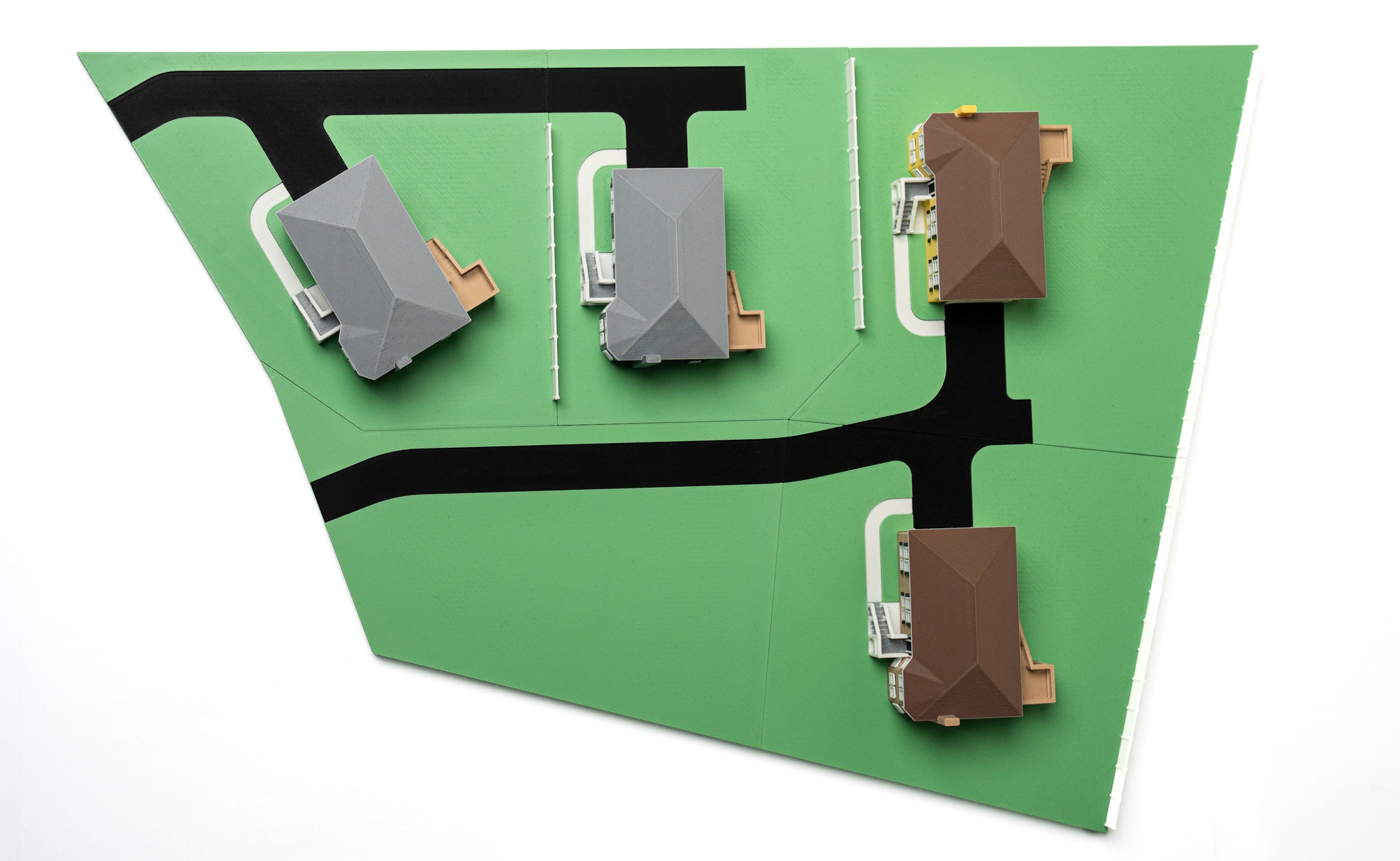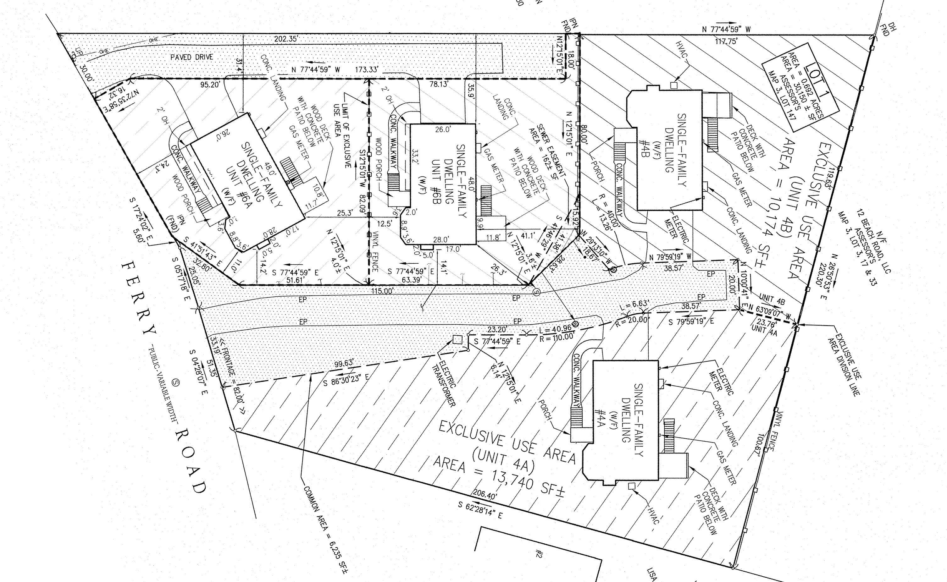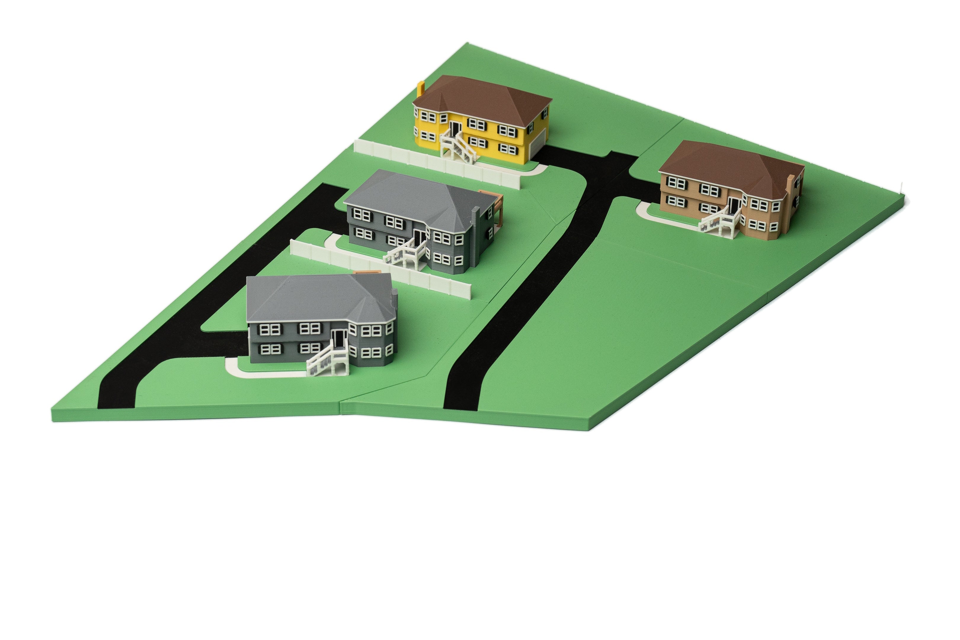 4-unit residential subdivision. Model features driveways, walkways, fences, decks and shutters.